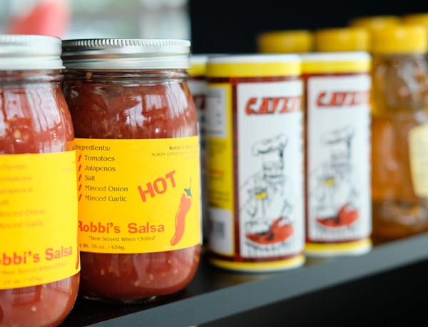 Local salsas, jams/jellies, pastries, breads, pastas, spaghetti sauce, granolas, coffees, peanut butters, and elderberry syrups,